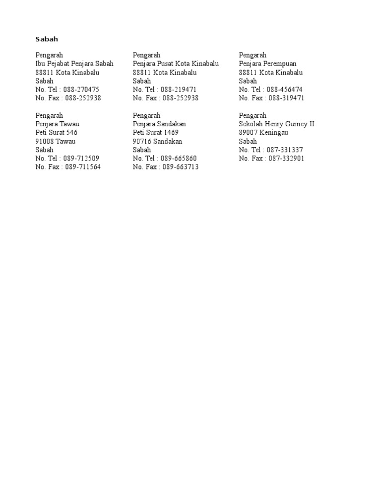 Ibu Pejabat Penjara Sabah - Majlis perunding & penasihat wanita (mppw).. Police headquarters / ibu pejabat polis. Datuk jame bin alip pengarah pendidikan negeri sabah. Ibu pejabat fama lembaga pemasaran pertanian persekutuan (fama) bangunan fama point lot 17304 jalan persiaran fama dot 4 (fama sap) (bahagian regulatori, pejabat timbalan ketua pengarah(operasi), bahagian institusi pemasaran, bahagian audit dalam) wisma sap, no. Pengerusi bn sabah, bung moktar radin, ismail sabri yaakob dan shamsul anuar nasarah telah tiba lebih awal. 2063, jalan ums, 88400 kota kinabalu, sabah.