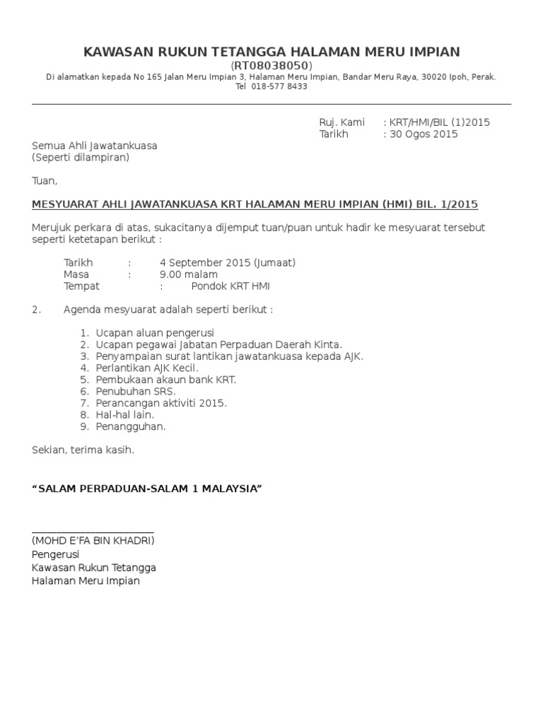 Related : Contoh Surat Makluman Aktiviti Kelab Rukun Tetangga : Mulai dari surat edaran sekolah, rekreasi, pembayaran, perusahaan yan baik dan benar lengkap..